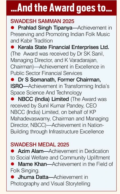 The Swadesh Sammaan Awards were conferred on Dr S Somanath, former ISRO Chairman; KP Mahadevaswamy, Chairman and Managing Director of NBCC; KFSE Chairman K Varadarajan and MD SK Sanil; and folk singer and Padma Shri Prahlad Singh Tipanya. Rajasthani folk singer Mame Khan, social activist Azim Alam, and photographer Jhuma Dutta were conferred the Swadesh Medal.