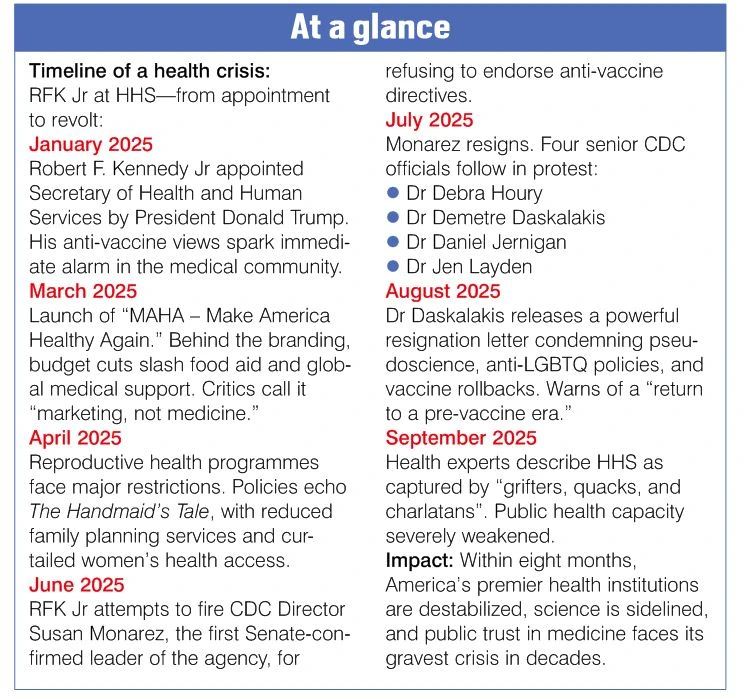 The crisis deepened when senior experts at the Centers for Disease Control and Prevention (CDC) resigned. Susan Monarez, the first-ever Senate-confirmed CDC director, refused to “rubber-stamp unscientific, reckless directives” or fire health experts. Her resistance triggered conflict with her boss, HHS Secretary Robert F Kennedy Jr, who tried to fire her despite her presidential appointment.